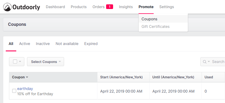 The Promote Panel allows you to create coupons for your store and to give gift certificates to Outdoorly users. Note that coupons and gift certificates you create will apply only to your own products.