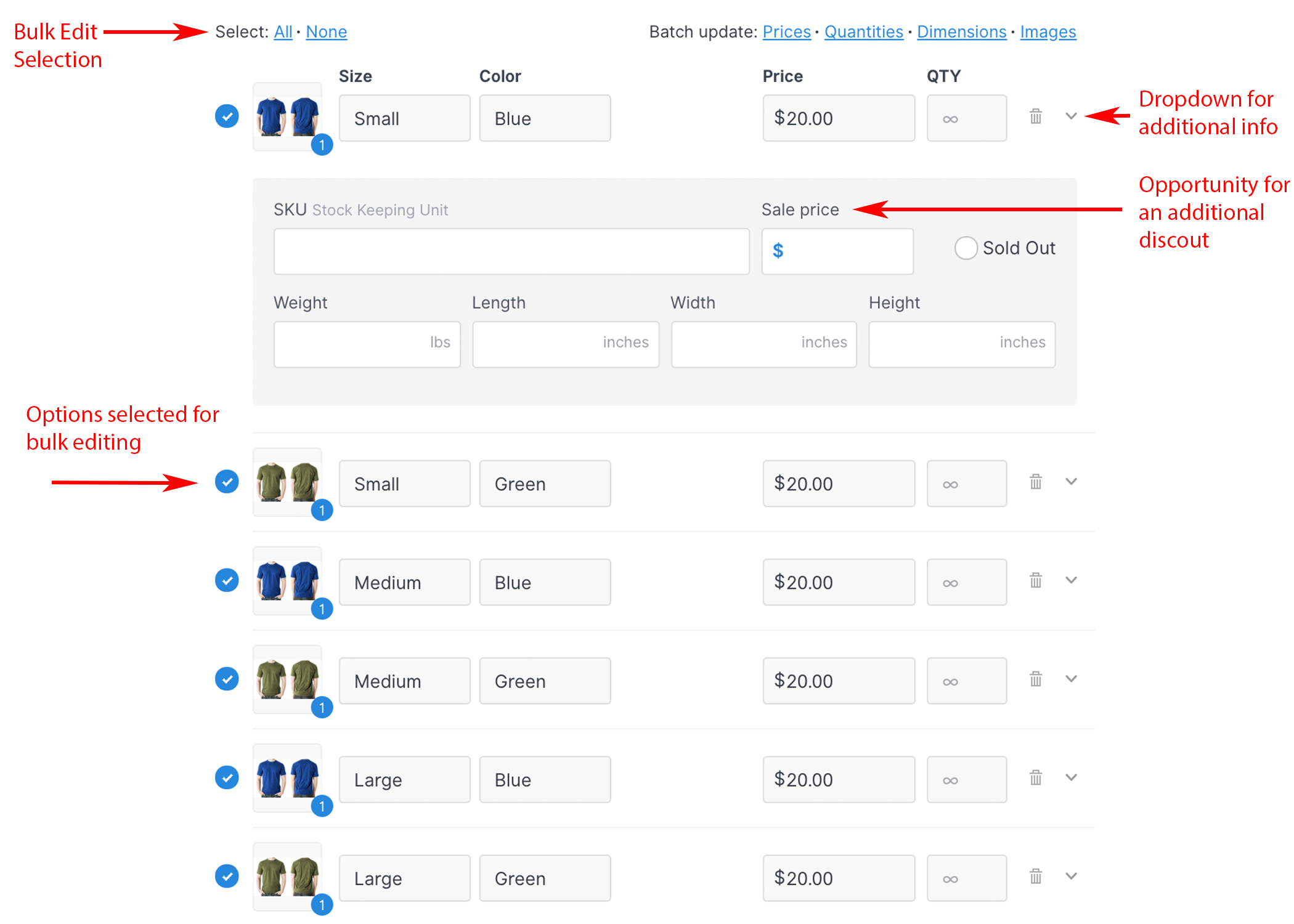 You have the ability to add Weight, Length, Width, and SKU numbers as well, but these are for only your own inventory and shipping purposes. These will not be shown on your product page. All of these values can be updated in bulk (except SKU) by selecting All on the far left or by individually selecting the circles on the far left (shown below).