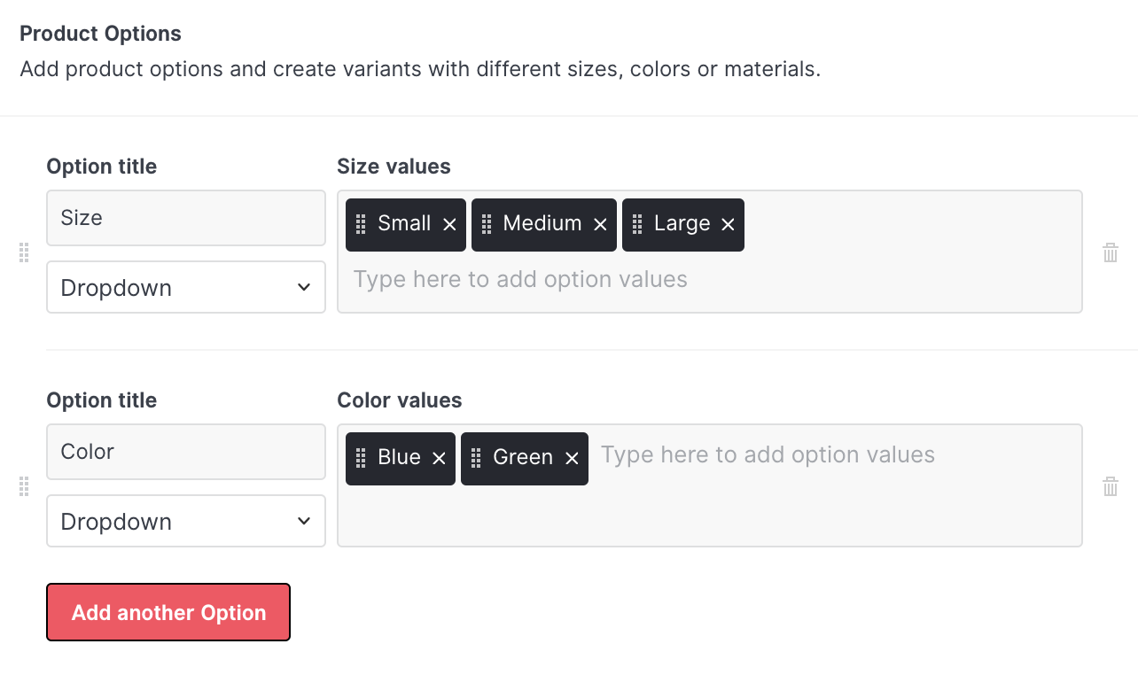 Size values: This is how your Option Title will be divided. For example, if your Option Title is Size, then your Size Values may be Small, Medium, and Large. If your Option Title is Color, then your Color Values may be blue and green. You can add as many Options as you wish.