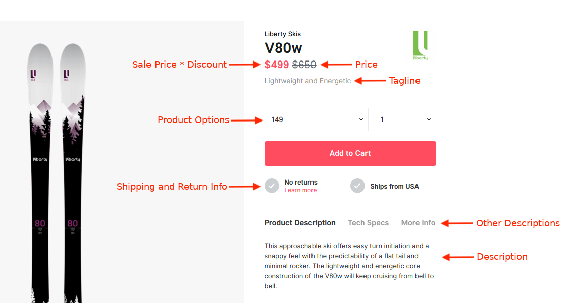 At a minimum, each product requires a title, a description, an image, a price, a shipping option, and a category. You can edit this criteria at any time by clicking on them from the “All Products” view. This help article details the fields available when creating or editing products. The following image shows where these fields appear on a product’s store page.