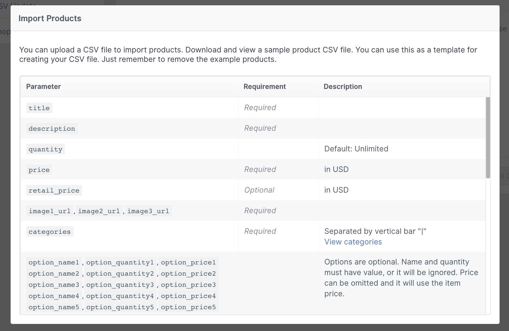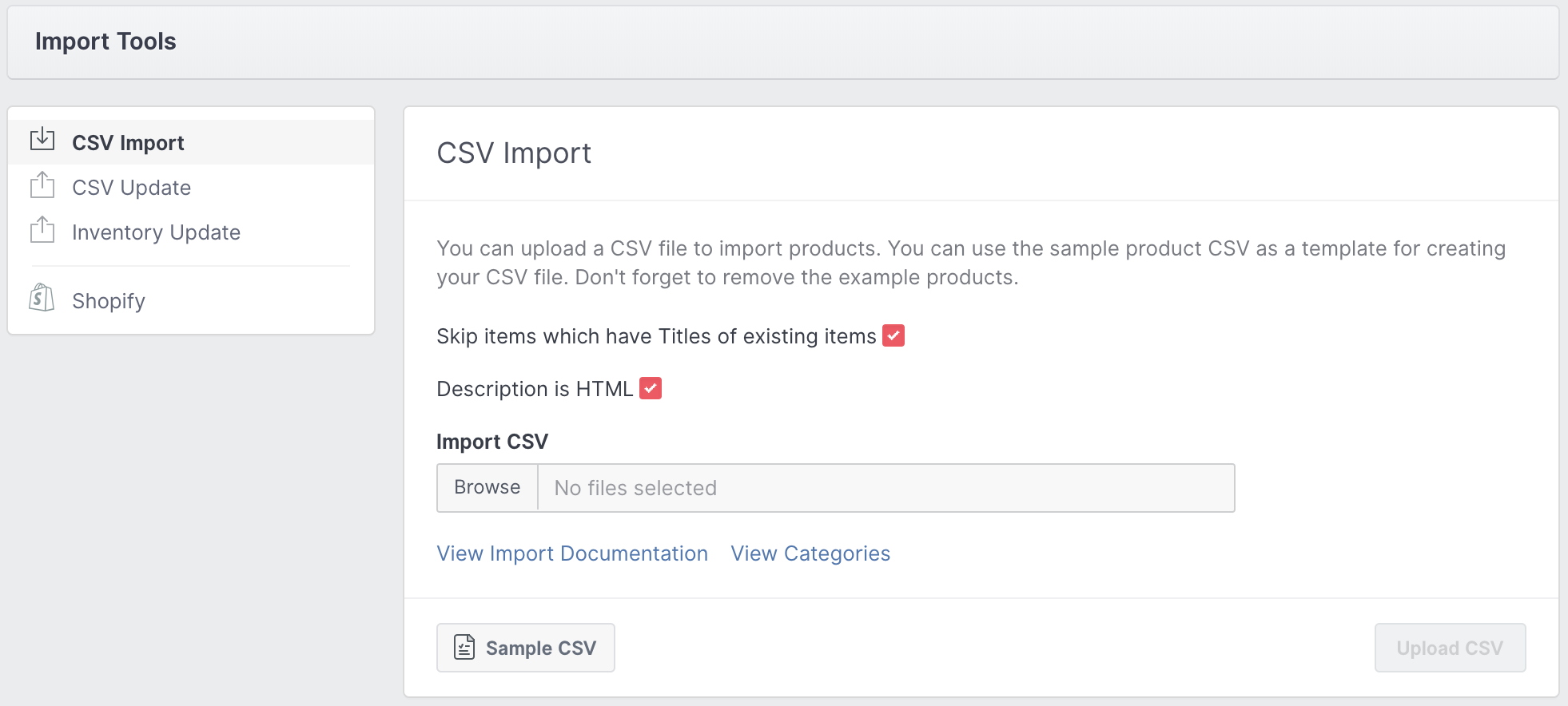 On the import tools page you have access to up-to-date import documentation which describes the required format for importing products. Click View Import Documentation to see it. You can also download the Sample CSV which contains an example product with populated fields. The category field is especially important. Read this help article for more information about categorizing products.
