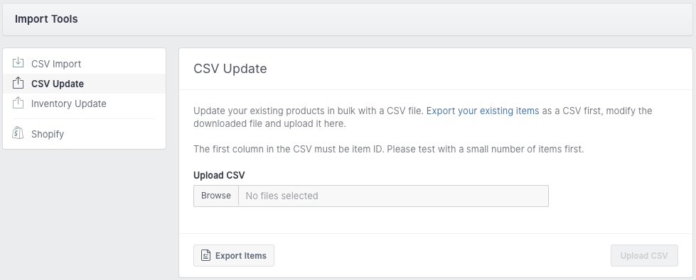 The first step is to export a CSV of your current store items by clicking Export Items. You can edit the downloaded CSV file to make changes, and reupload the file to the same page. Be sure to not alter the format of the file while making changes.