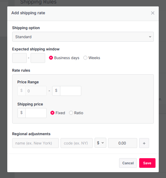 This is the shipping price that customers will be charged to ship products this rate applies to. The price can be set as a fixed number (Ex: $9.95) or as a ratio of purchase price (Ex: 7%).