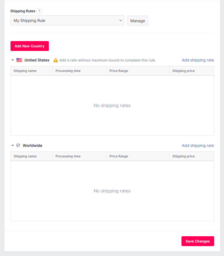 Once you have created a new shipping rule, you will need to add shipping rates for each region you want to ship to. By default, two shipping regions are provided, the US and International (currently this only includes Canada). You can add countries you wish to define custom rates for using the Add New Country button.